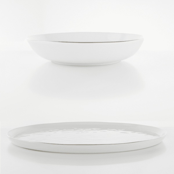 Eleganza, stile e attenzione ai dettagli: la linea Onix White, in porcellana rifinita a mano e decorata in vero oro 12 kt, splende sulla tavola rendendo ogni mise en place perfetta per chi desidera un lusso quotidiano. La sua particolare forma irregolare, frutto di un lavoro artigianale, caratterizza ogni articolo, su cui spicca un marchio in oro che crea uno stile inconfondibile per cene scintillanti e di classe.